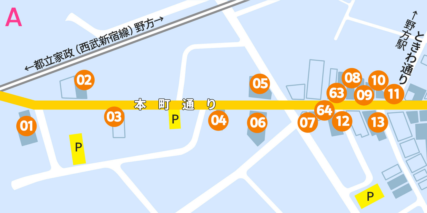 あ ……あいりすスタンプ加盟店H ……なかのハート商品券取扱店ナ ……ナカペイ取扱店 01 榎本ガラス店 あHナ 02 美容院 m-fleckHナ 03 ごせい野方ケアステーション 04 おりじなるぼっくす中野店ナ 05 Bakery Cafe CuiCuiHナ 06 NPO法人すばる会すばるカンパニー 07 スガタカタチHナ 08 リリーマルレーンHナ 09 フラワーショップ Rocca_RoccaHナ 10 たなか理髪店H※非掲載 11 買取専門店こやし屋野方店 12 パートナー整骨院ナ 13 (株)KIK・トータルホームズ 63 韓食堂ボチャン 64 Zacks 14 酒場はとまめ 15 鳥富士 Hナ 16 お好み焼きぱあるHナ 17 篠勝商店 野菜果実専門店H 18 コンサートホール野方 19 和食処とっとっとナ 20 えんハウジング野方本店 21 支那そばあまちゃんHナ 22 魚正水産 23 sara歯科クリニック 24 ダンスムーヴ 25 炉端屋台囲み屋/おでん割烹日南乃 26 オンリーワン 27 笑顔道整骨院野方院 28 HAIR ATELIER YUI 29 ドコモショップ野方店 30 餃子の王将 野方店H 31 ちひろこどもクリニック 32 ヘアマインド シガH 33 おおくぼ青果店 34 リアルティ三山 35 野方食堂H 36 松屋野方店 37 ファミリーマート野方駅南店 38 立呑み晩杯屋野方店 39 セワロKitchen@Bar 40 輝道家 41 100円ショップワッツ野方店 42 nukuku HAIR AND SPA 43 のがた眼科クリニック 44 東京ひよこ中野店ナ 45 個人指導の学習塾スクールIE 46 友内歯科医院 47 プロフメリア・コンドウ あHナ 48 ちよだ鮨 野方店 49 オホーツク北見焼肉のっけ東京野方店 50 ヘアーメーク TestavantiHナ 51 都民ファーストの会大沢ひろゆき事務所 52 チッチョベッロHナ 53 フラワー薬局 野方店 54 焼肉酒場 牛膳 55 バーバーショップスズキHナ 56 星の隠れ家 H 57 Bed&Stay 野方 58 NPO法人ポタジェの会 59 あかね訪問看護ステーション [地図掲載外] 60 Kita・Design・Labo 61 株式会社xalibre(ザリブレ) 62 たからゆナ 他の通りを見る ●北原通り ●ときわ通り ●駅前通り ●みつわ通り