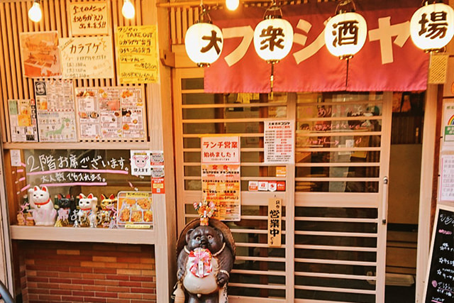 看板たぬきが目印の大衆酒場。豊洲直送の生本まぐろは絶品!他にも自家製ローストビーフなど大衆酒場ならではでのいろいろなメニュー。人気の唐揚げはテイクアウトもOK